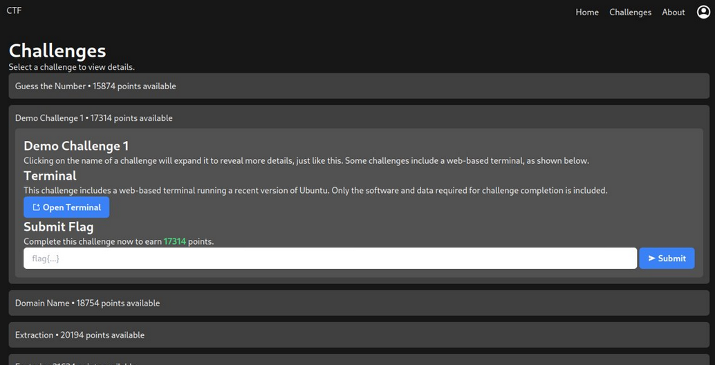 Some challenges also include a web-based terminal. It automatically uses WebSockets to connect to an Ubuntu-based virtual machine running on the host system. Every time I type a letter, it sends the input to the server, which processes what I typed and sends it back to the browser. The VM itself is not connected to the internet, but any files necessary for challenge completion are mounted inside the image.
