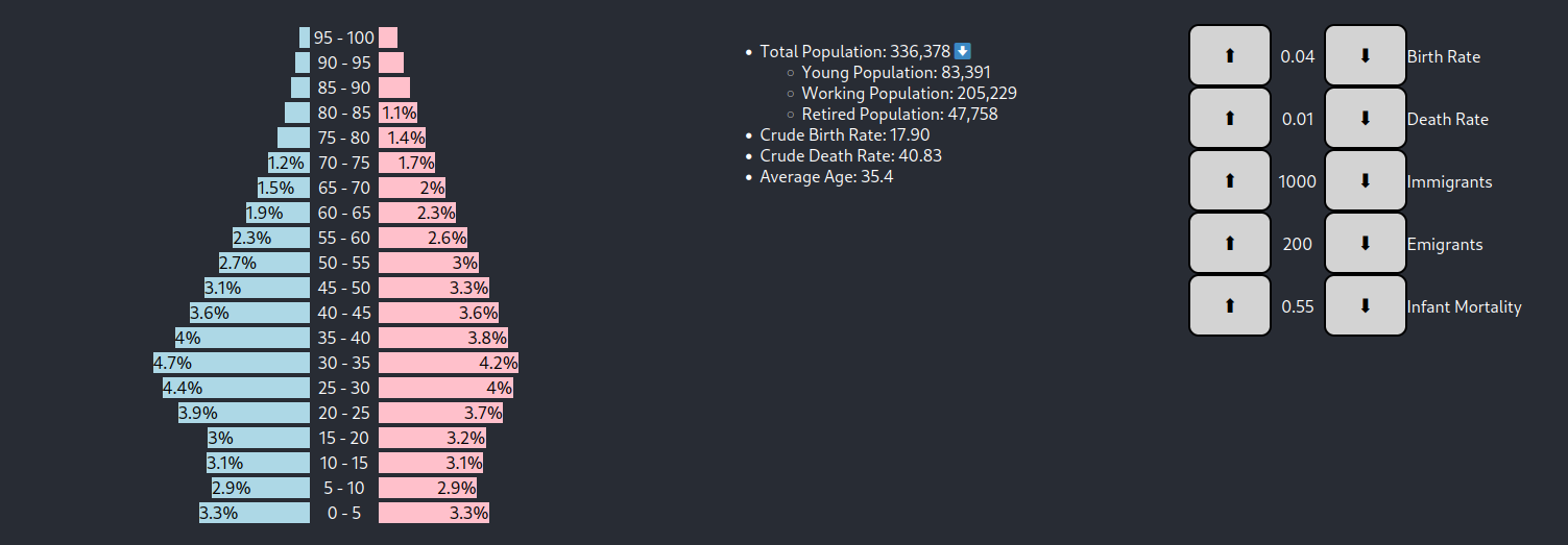An interactive population pyramid game that allows the user to see the consequences of certain actions and policies on the population.
